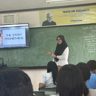 September 25th is our schedule to do our teaching demonstration and then get evaluated by our mentor and coordinator teacher. Me and my teaching partner take a role where he was the one who opened and closed the class and i was the one who responsible to delivered the material which is The Story of Prometheus.